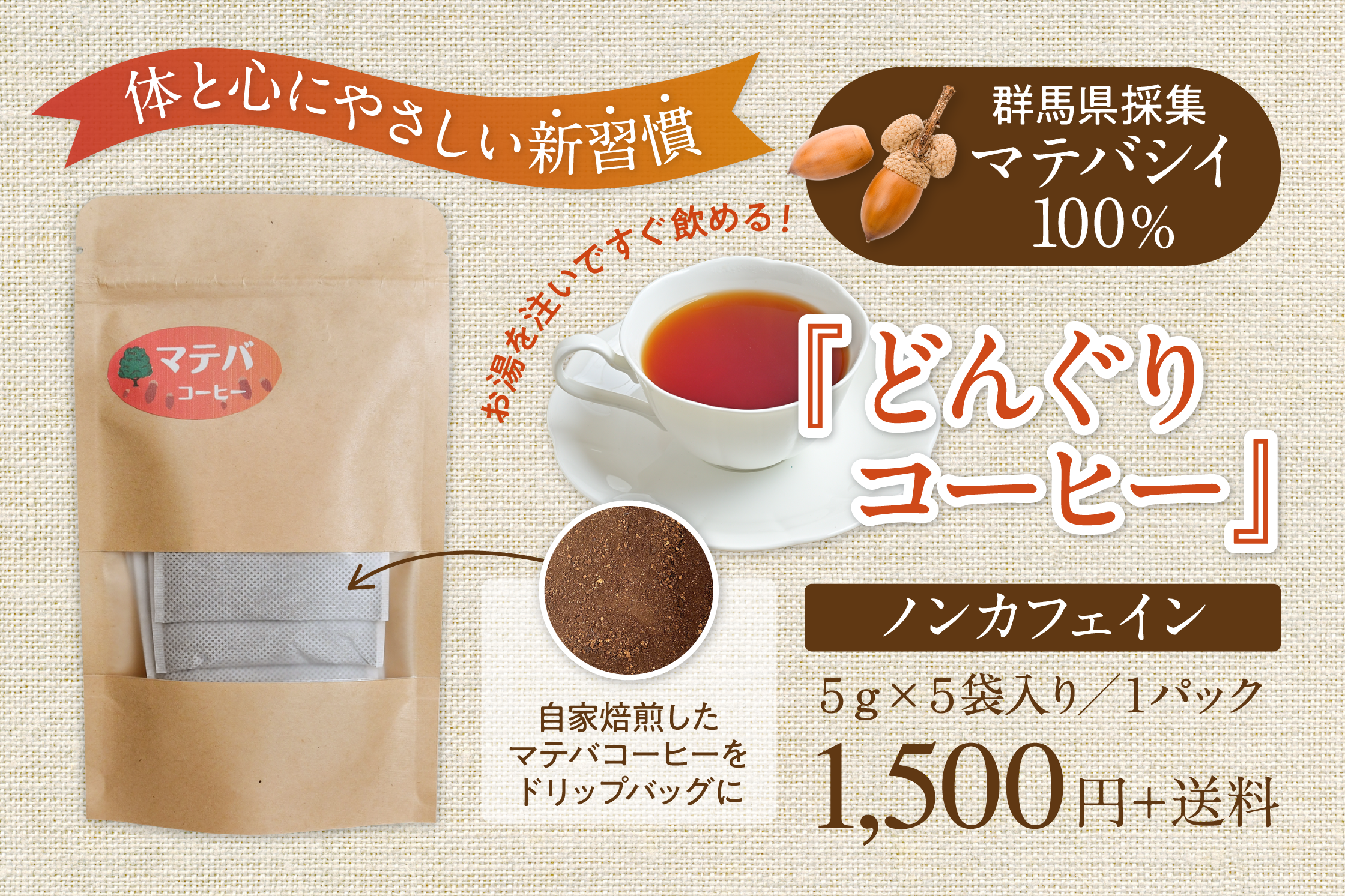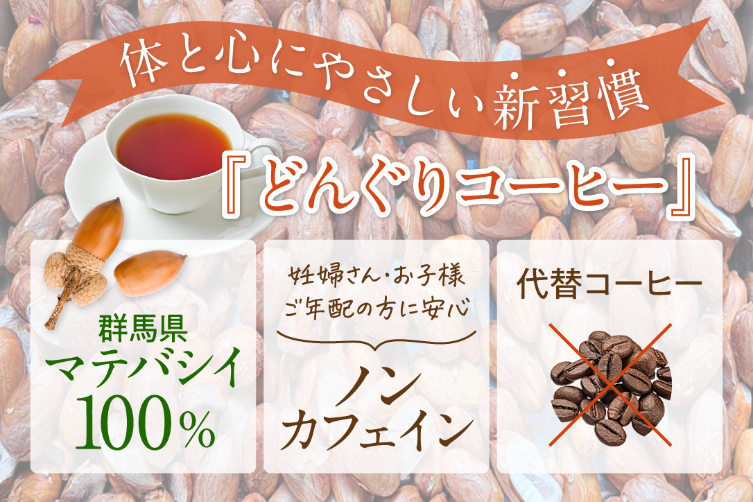 当社の「マテバコーヒー」は、群馬県で採取されたマテバシイを100%使用し、丁寧に焙煎・製造されたこだわりの代替コーヒーです。カフェインフリーで、妊婦さんやお子様、ご年配の方にも安心してお楽しみいただけます。ナッツのような風味と優しい味わいが、心と体をほっと癒してくれます。
