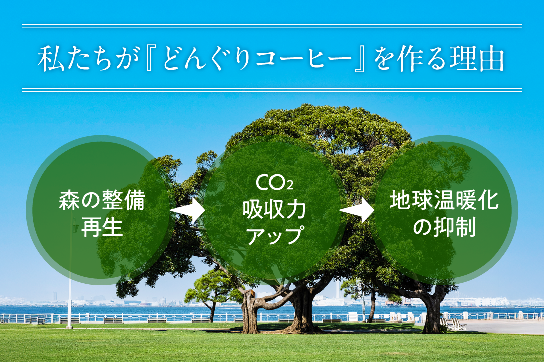私たちがどんぐりコーヒーを作る理由は、単なる「商品開発」ではありません。森を整備し、どんぐりが豊かに育つ環境をつくること。それが結果として森林のCO₂吸収量を高め、地球温暖化の抑制につながると考えています。